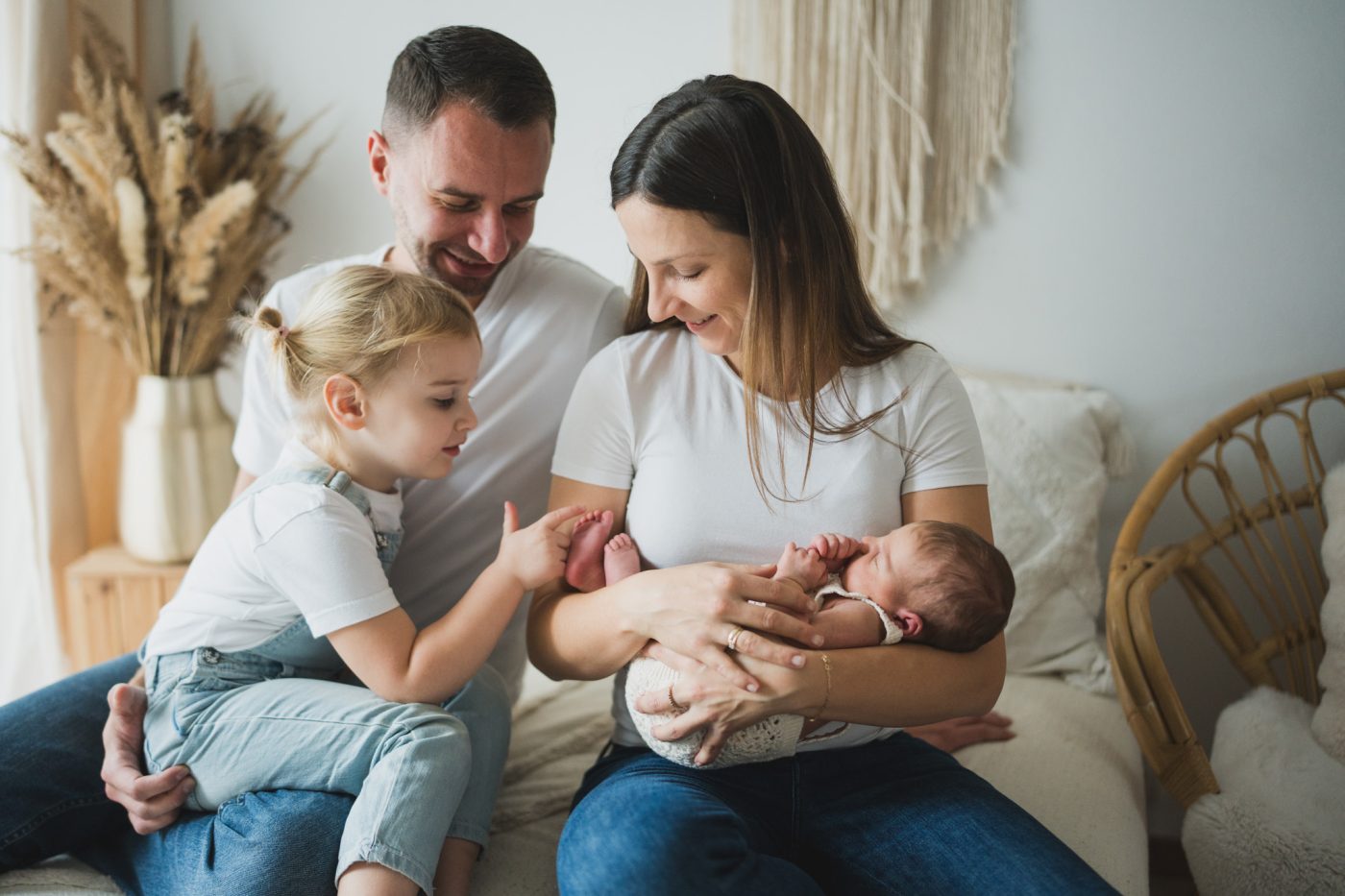 Sesje noworodkowe to jedne z najbardziej wyjątkowych chwil, które mogę dla Was zatrzymać w kadrze. Tym razem w moim studio w Poznaniu gościłam cudowną rodzinę – świeżo upieczonych rodziców z dwoma córeczkami. Starsza, trzyletnia siostrzyczka, z ogromną radością witała swojego maleńkiego braciszka. Dzięki temu podczas zdjęć udało się uchwycić wiele autentycznych emocji – od nieśmiałych uścisków po szczere, dziecięce uśmiechy.